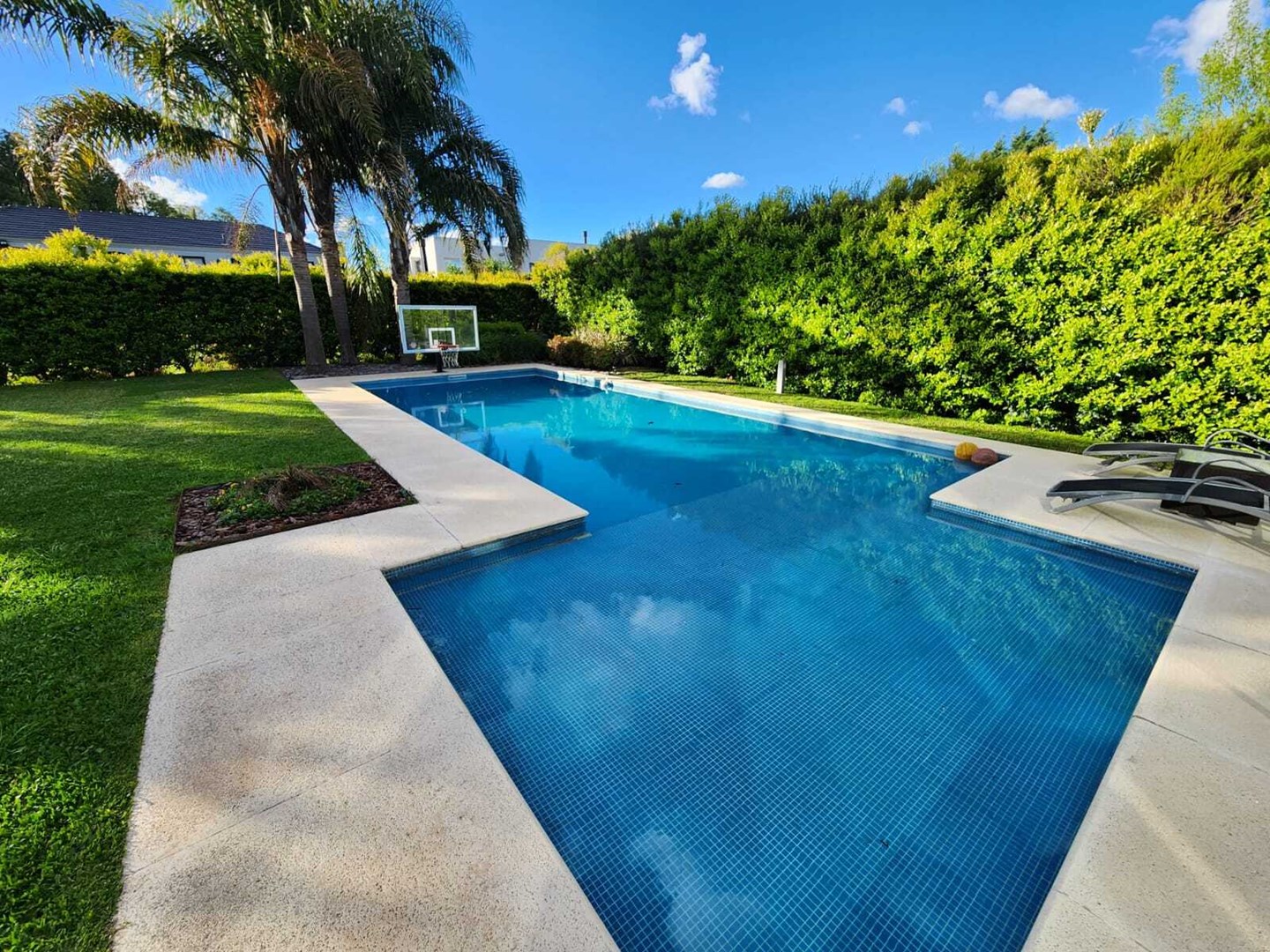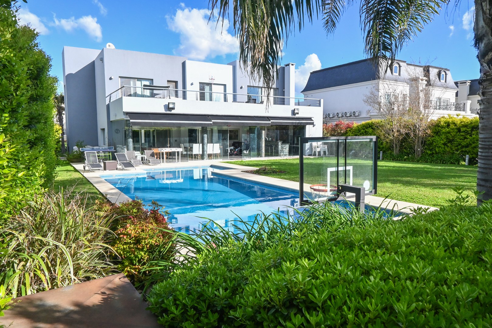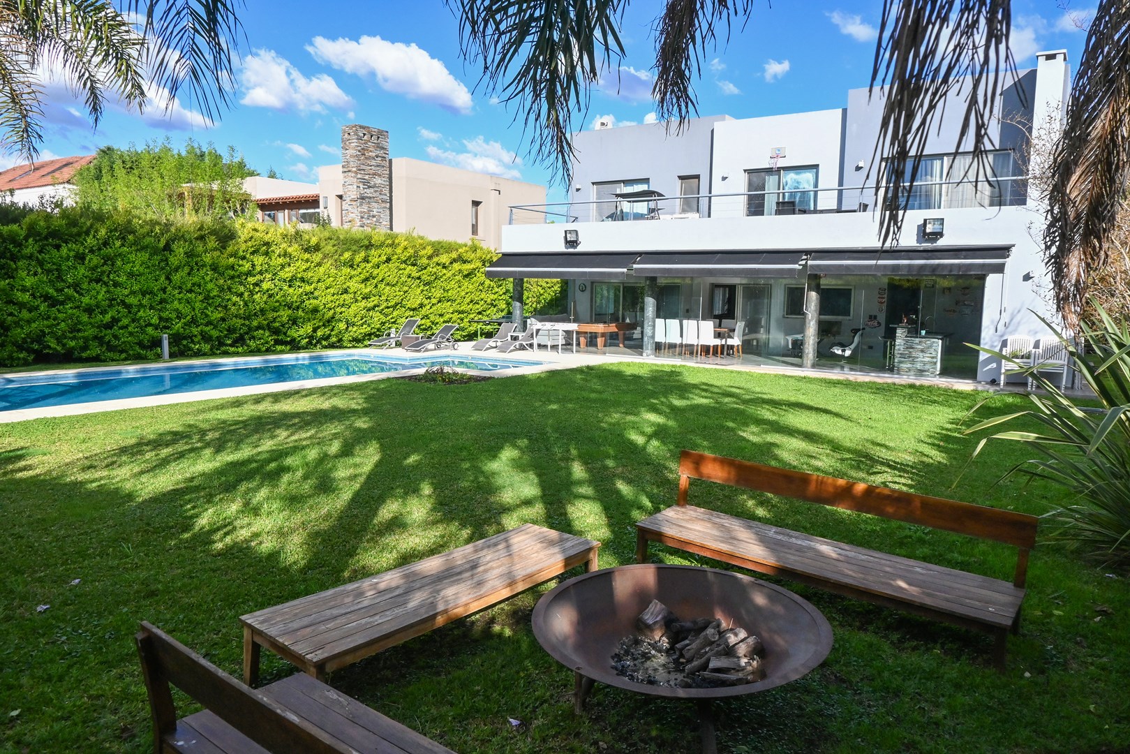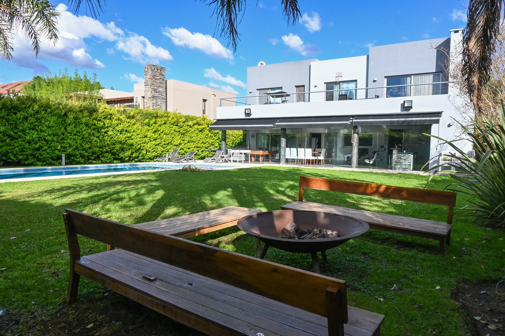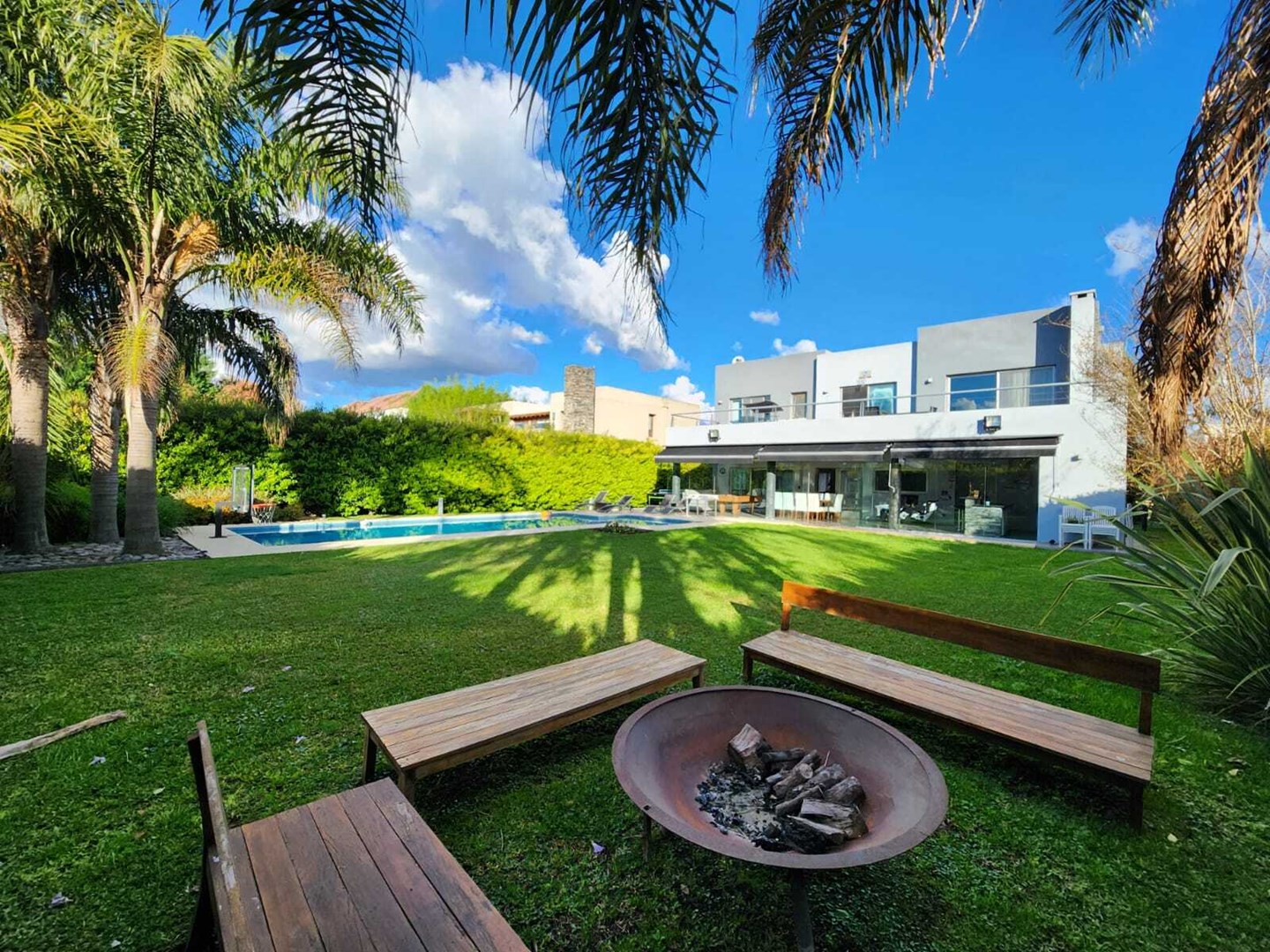 IMPECABLE!! Excelente casa Moderna, de 5 dormitorios sobre lote central de 1060 m, a la venta en la Lomada de Pilar, con excelente ubicación y calidad de construcción! En PB ingresamos a un gran ambiente concepto abierto, muy amplio y luminoso, que integra el estar-living con el comedor principal, placard de recepción, y toilette de recepción. Cuenta además con un estudio amplio, apto 5to dormitorio (en PB). Hermosa Cocina totalmente equipada con muebles tipo rauvizio y gran isla central. Lavadero amplio con espacio para lava/secarropas/freezers secundarios. Dependencia de servicio con baño completo, ideal para el parque/piscina. Exterior: Gran galería con cerramiento vidriado, parrilla a gas, y horno pizzero. Hermoso parque con riego automático, piscina revestida y climatizada de 50 m2. Cochera semicuebierta para 2 autos y gran explanada vehicular para 4 autos adicionales. PA: Gran pasillo que conecta los 4 dormitorios. 2 de ellos en Semisuite que comparten un baño completo, y una bellisima terraza con vistas al parque. Suite amplia con vestidor y baño completo. Y Master suite con baño con jacuzzi, gran vestidor, y hermosa terraza. Detalles: aberturas con DVH, pisos de porcelanato, calefacción por losa radiante, refrigeración por splits frio/calor en todos los ambientes, termotanque de alta recuperación y bomba de filtrado automático NUEVOS.
