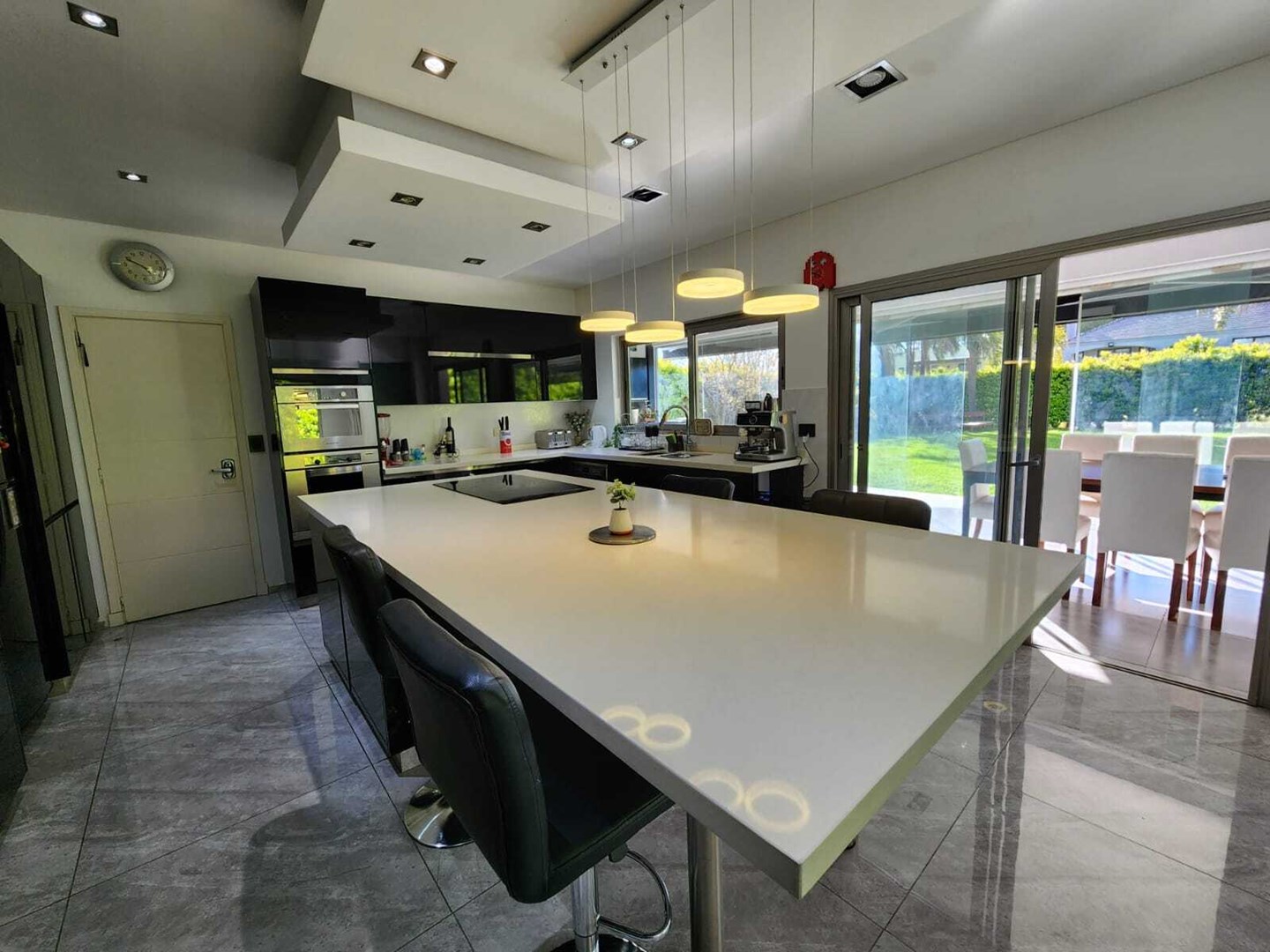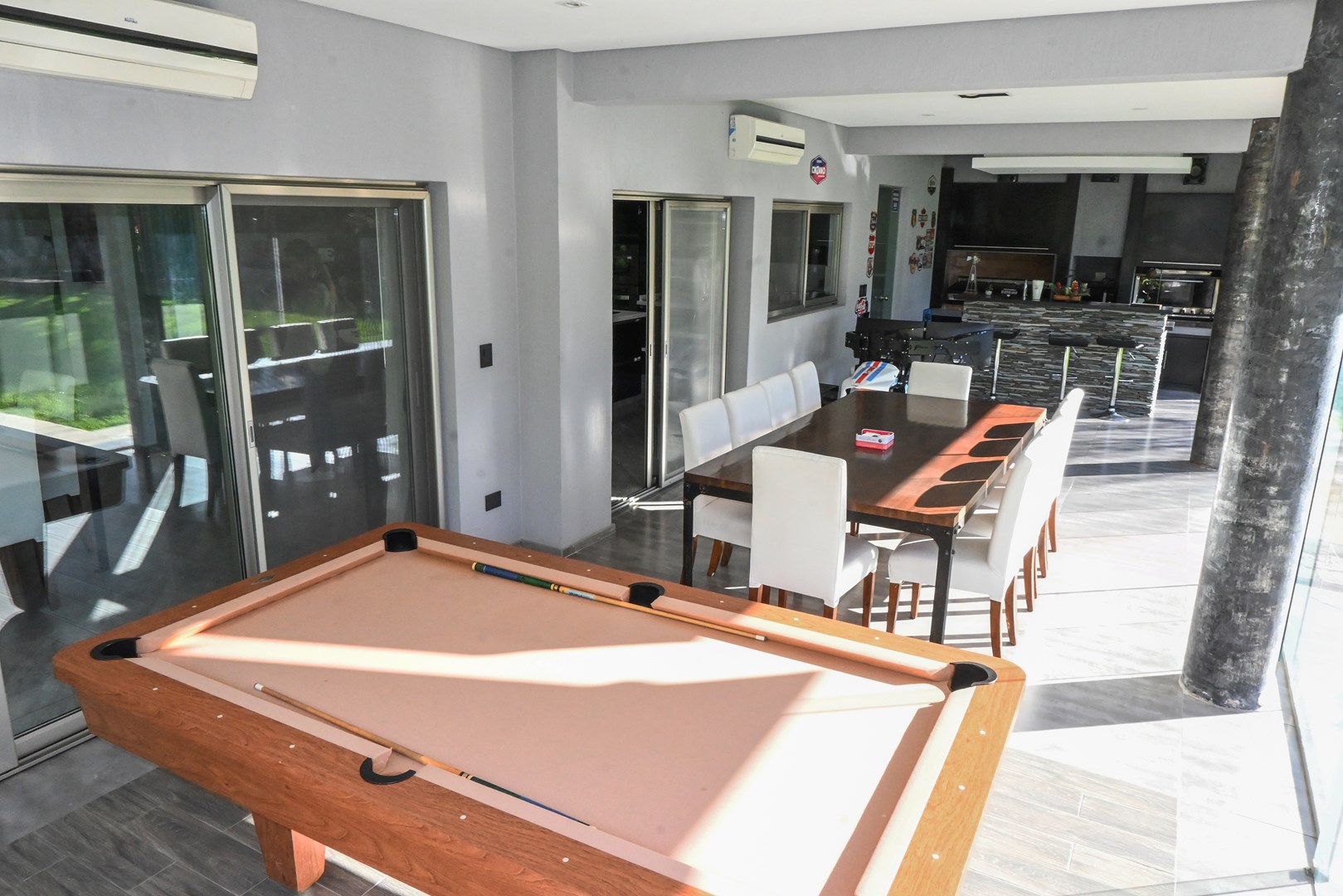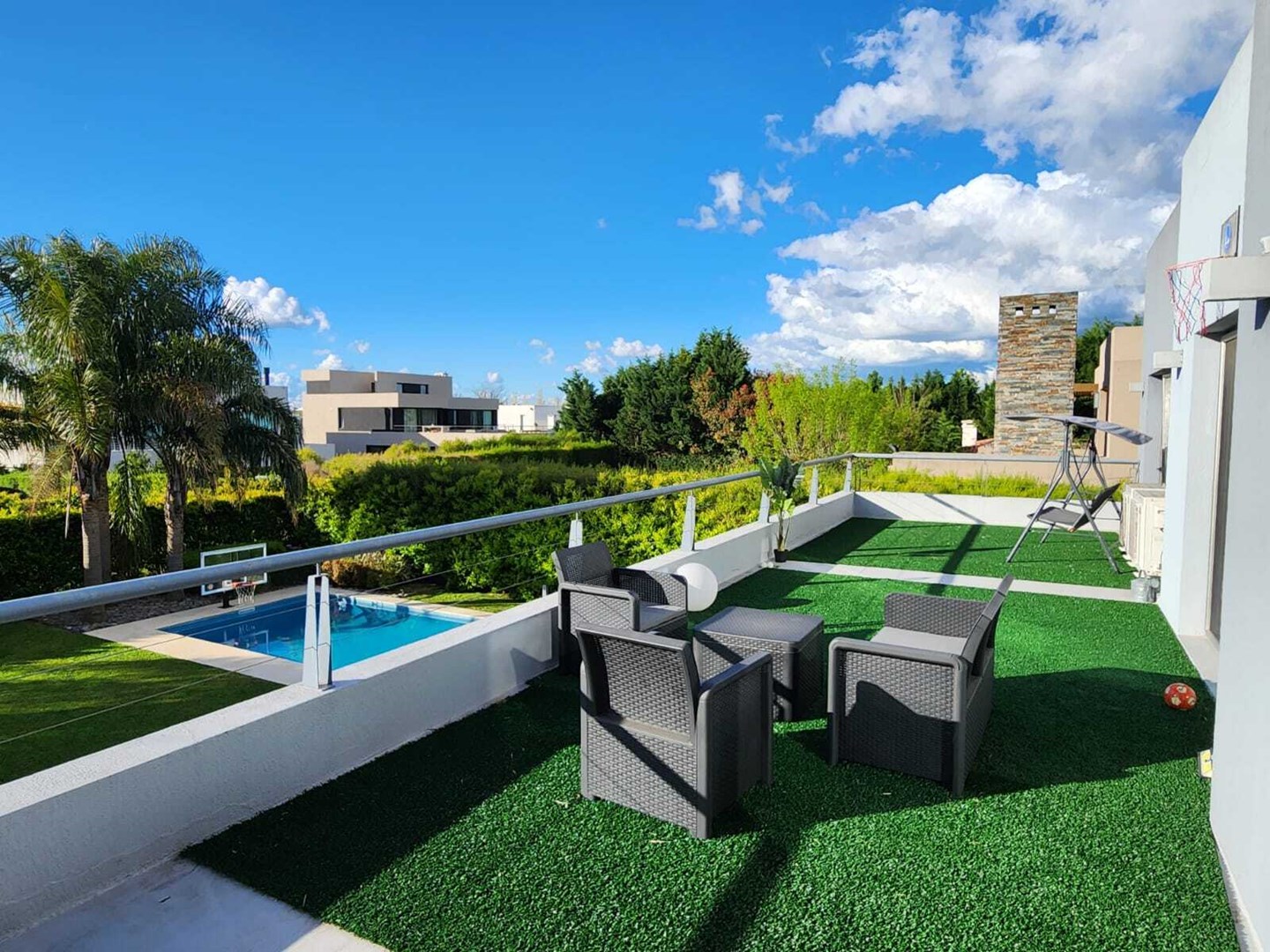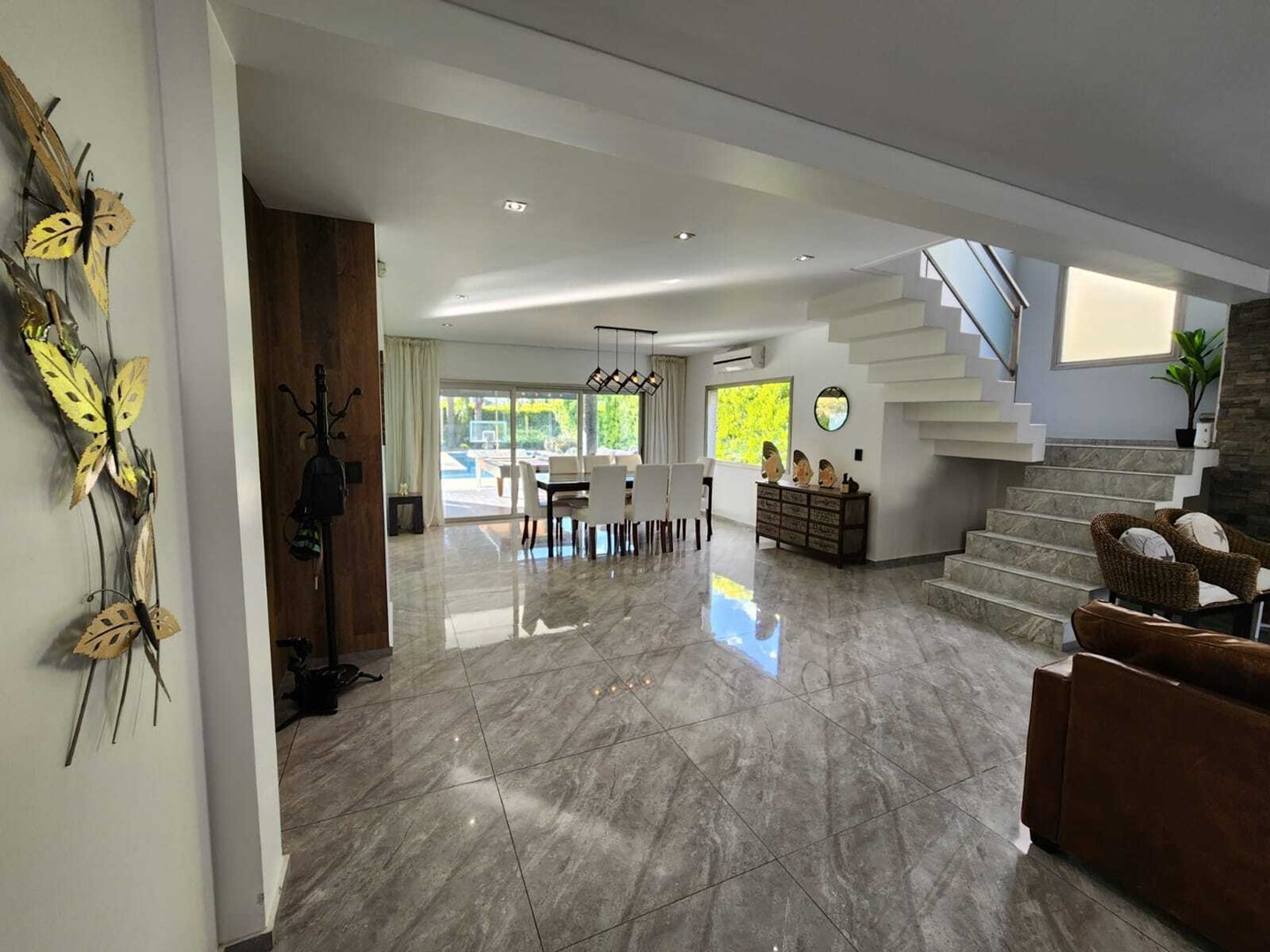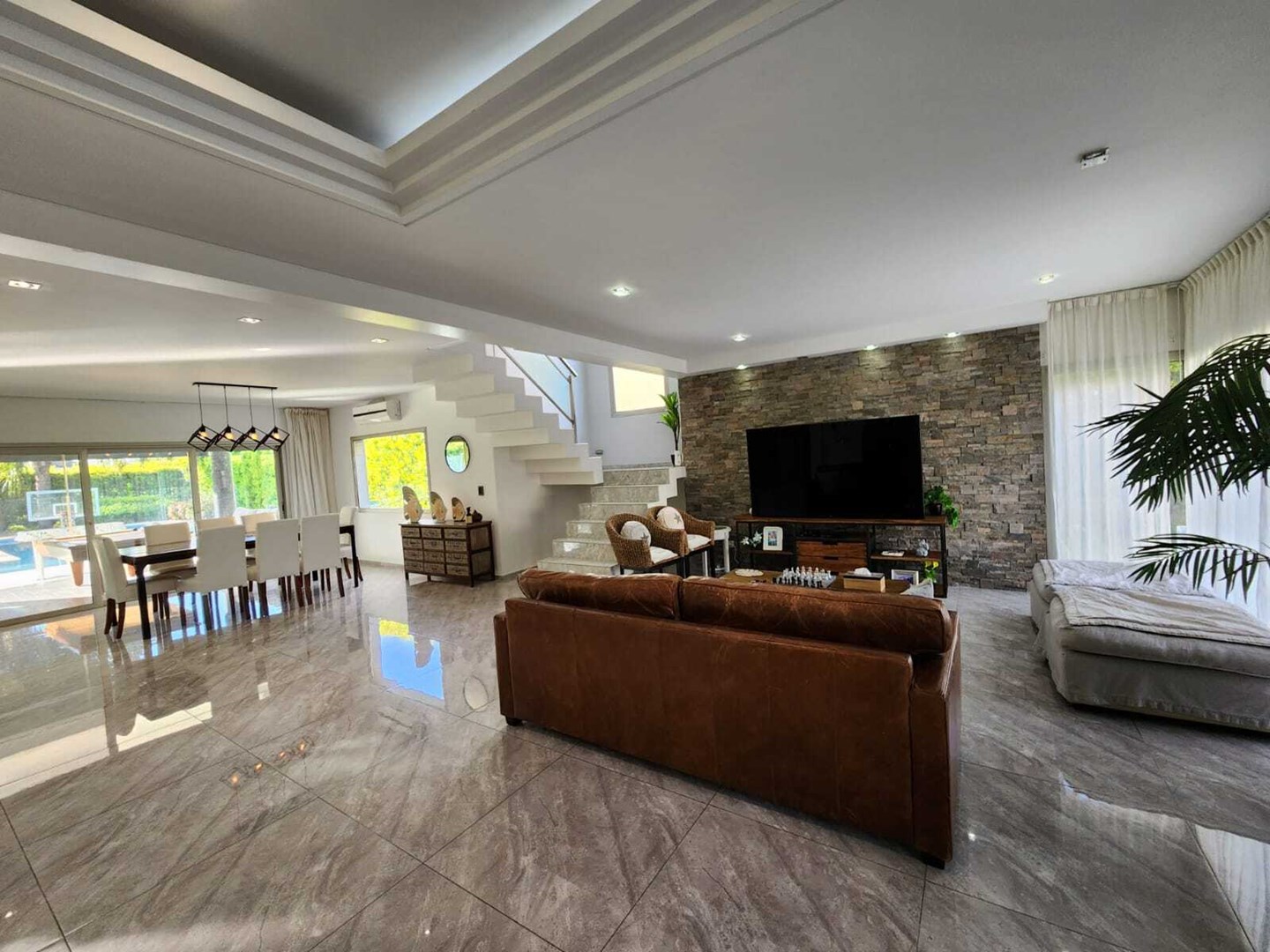 IMPECABLE!! Excelente casa Moderna, de 5 dormitorios sobre lote central de 1060 m, a la venta en la Lomada de Pilar, con excelente ubicación y calidad de construcción! En PB ingresamos a un gran ambiente concepto abierto, muy amplio y luminoso, que integra el estar-living con el comedor principal, placard de recepción, y toilette de recepción. Cuenta además con un estudio amplio, apto 5to dormitorio (en PB). Hermosa Cocina totalmente equipada con muebles tipo rauvizio y gran isla central. Lavadero amplio con espacio para lava/secarropas/freezers secundarios. Dependencia de servicio con baño completo, ideal para el parque/piscina. Exterior: Gran galería con cerramiento vidriado, parrilla a gas, y horno pizzero. Hermoso parque con riego automático, piscina revestida y climatizada de 50 m2. Cochera semicuebierta para 2 autos y gran explanada vehicular para 4 autos adicionales. PA: Gran pasillo que conecta los 4 dormitorios. 2 de ellos en Semisuite que comparten un baño completo, y una bellisima terraza con vistas al parque. Suite amplia con vestidor y baño completo. Y Master suite con baño con jacuzzi, gran vestidor, y hermosa terraza. Detalles: aberturas con DVH, pisos de porcelanato, calefacción por losa radiante, refrigeración por splits frio/calor en todos los ambientes, termotanque de alta recuperación y bomba de filtrado automático NUEVOS.